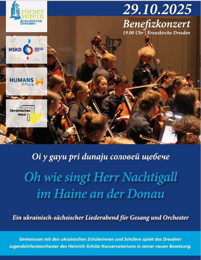 Musik verbindet – über Ländergrenzen und Sprachen hinweg: Ende Oktober reisten 20 junge Musikerinnen und Musiker des ukrainischen Jugendensembles „Dominanta“ aus Brody nach Dresden, um gemeinsam mit dem Jugendsinfonieorchester des Heinrich-Schütz-Konservatoriums Dresden zu proben und aufzutreten. Die HuManSStiftung hat den Aufenthalt finanziell ermöglicht – eine Woche voller Musik, Begegnung und gegenseitigem Kennenlernen, die in einem Benefizkonzert in der Kreuzkirche gipfelte.